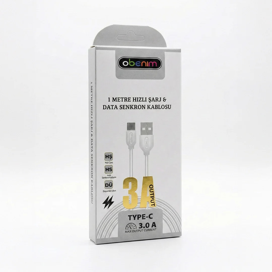 Obenim 3A Type-C sarj kablosu, 1 metre uzunluğundaki dayanıklı yapısıyla cihazlarınız için yüksek hızlı şarj ve kesintisiz veri senkronizasyonu sağlar.